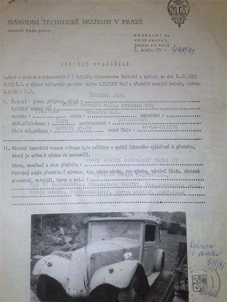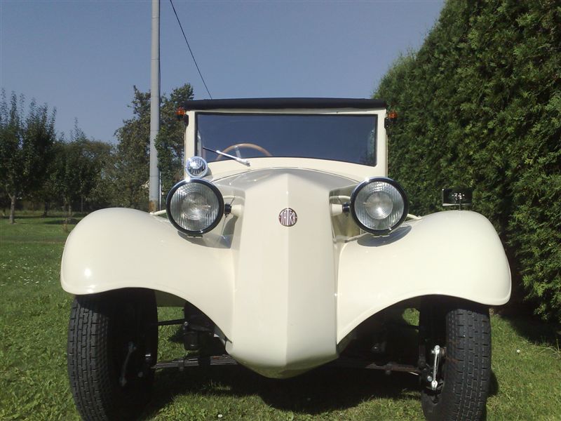 Svoji Tatru zakoupil v roce 2003 ze Zábřehu od pána, který neměl ani čas, ani chuť ani peníze auto opravdu z gruntu renovovat. Bylo celkem kompletní, chyběly jen nějaké drobnosti – pokud za drobnosti považujete původní reflektory Joro, klakson Bosch, směrovky Scintilla apod. Když prozkoumal zbytky laku na voze, pod čtvrtou vrstvou našel odstín světlé barvy – cosi jako slonovou kost. Na voze byla původní přístrojová deska, spínací skříňka, vlastně nic moc nechybělo. Motor se nechal protočit, vypadalo to že měl i kompresi. Až během renovace pan Kunc zjistil, že vůz je vlastně ve velmi špatném stavu, a to téměř po všech stránkách. Celkem dobře vypadala jen původní kožená sedadla. Za vše – ve stavu podle černobílých obrázků – zaplatil 39 000,- Kč. To nebyla špatná cena za veterána, ale ta hlavní investice teprve měla přijít. Po dvouletém parkování v garáži pan Kunc uhranul zkušeného kamaráda, aby se mu pustil do renovace vozu. Práce na voze zabraly téměř dva roky, ale poctivý přístup se vyplatil. Když byl obnoven lak a vše bylo tak krásně nové, pan Kunc to nevydržel a místo zachovalých původních kožených sedaček si nechal udělat kompletně nové kožené čalounění – včetně nových sedaček. Ani odstín čalounění není původní, protože ho majitel vybíral s ohledem na nový lak vozu. V současné době pan Kunc ještě čeká na několik chromovaných okrasných lišt kolem střechy a hlavní práce bude hotova. Tatra nyní projde testací vozu a bude mít veteránská čísla. Auto bylo v Kopřivnici objednané 1.7.1933 panem dr. Hansem Sturmem z Reichenbergu –z Liberce pod objednacím číslem 3082/ 33. Šlo o typ T57 kabriolet Lux a vůz byl převzat prvním majitelem 25.8.1933. I po všech historických peripetiích vozu dodnes souhlasí číslo rámu i motoru. Během renovace majitel posháněl chybějící „cukroví“ jako světlomety a pod, ale zatím jezdí s karburátorem Jikov. Původní anglický Amal 26 VD už sehnal, ale nyní hledá někoho, kdo by karburátor odborně renovoval. Z dokladů k vozu má pan Kunc jen Odborný posudek Národního technického muzea z počátku 90. let 20. století, který si nechal vypracovat jeden z předchozích majitelů z Brandýsa nad Labem. Vůz je v něm popsán jako nekompletní, nepojízdný a téměř úplně shnilý – smyslem posudku bylo, aby cena byla co nejnižší. Odhad zněl na 15 tisíc Kč. Vůz měl směřovat do Německa, ale z koupě podle všeho sešlo. Foto: M.Kunc, Klimkovice (9/08)